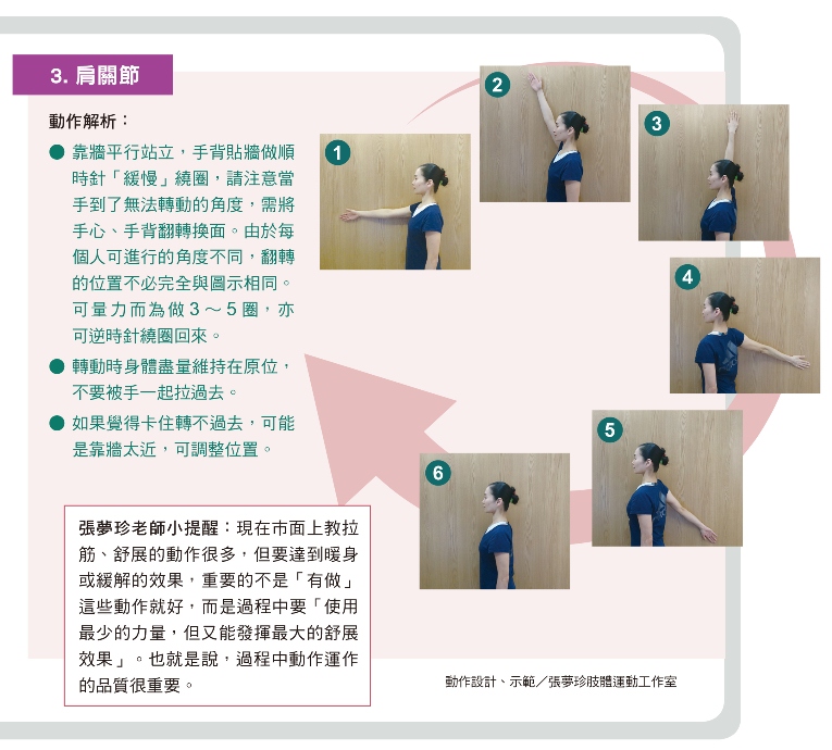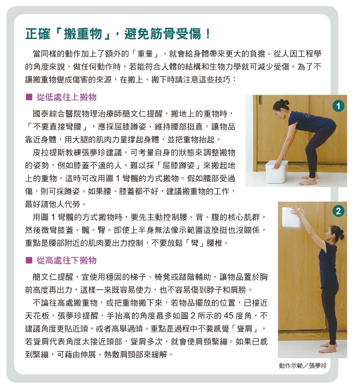 以擦桌子為例,張夢珍老師建議施力的方向,是從「肩膀→手肘→手掌」來推進,也就是使用整隻手的多關節來完成動作;有些人只是左、右轉動手腕來擦桌子,累積久了就容易痠痛或受傷。而其他像掃地、搬重物等動作,同樣也是多關節優於單關節施力。(延伸閱讀:居家清潔,哪些天然清潔劑有效又不傷手?)