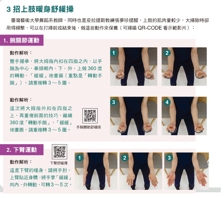 除了可在大掃除前做暖身舒緩操舒展筋骨;不舒服時,也可用舒緩操來放鬆緊繃的肌肉。此外,掃除流程如果設計得好,也可讓身體做「微運動」,減少痠痛的發生機率。專家建議這樣安排大掃除: