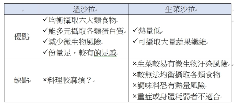 可能會有人疑惑,溫沙拉與生菜沙拉有什麼不同,兩者有哪些個別的優缺點?擁有八年教學醫院臨床經驗的台北市居家個案營養師陳柏方,將兩者分別列出優缺點,可以看出溫沙拉優點真的很多,不但能均衡攝取六大類食物,加熱過的食物還能減少微生物感染風險,此外,溫沙拉習慣搭配較具分量的肉類、魚類及蔬果類等,通常會有一定的飽足感。