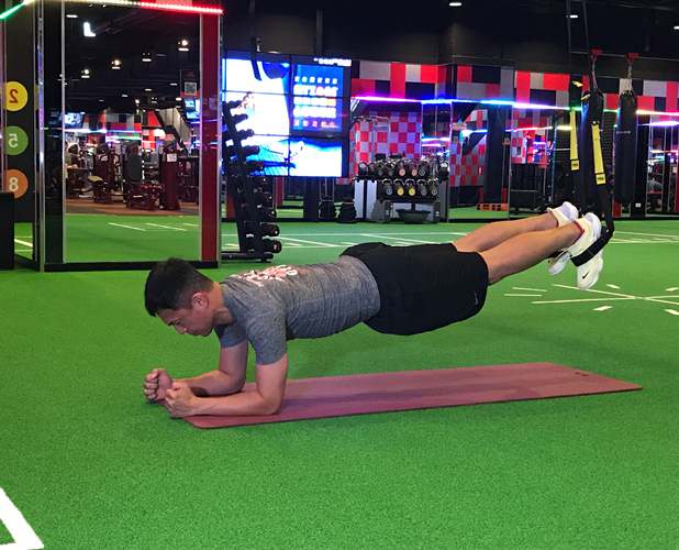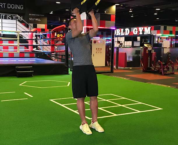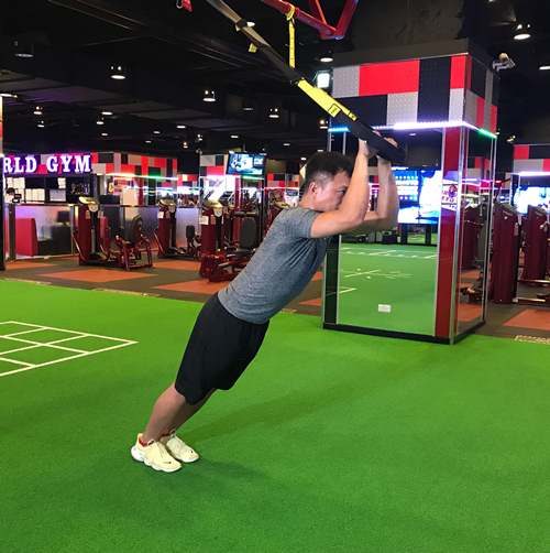 (1) 採站姿、身體向前傾,重心平均落於雙腳之間、雙腿與肩同寬,正手抓穩TRX,身體維持骨盆與脊柱在良好曲線,收下顎,肩帶穩定不聳肩。