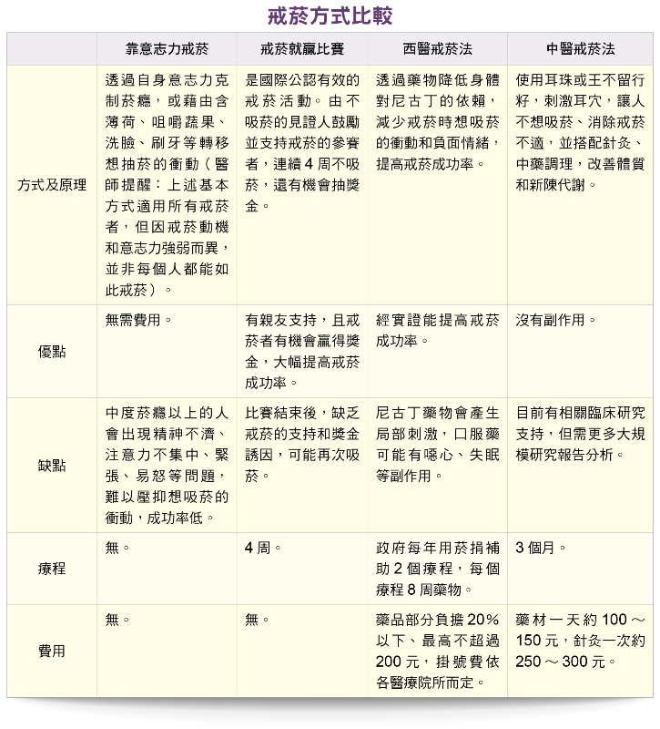 衛生福利部國民健康署指出,國際實證顯示,單靠意志力戒菸,成功率僅3~5%,若有專業協助戒菸,成功率可提高8~10倍。以開設戒菸門診多年的臺安醫院來說,透過藥物治療和衛教輔導,1年的戒菸率約40%;中醫師公會全國聯合會理事長柯富揚表示,經由中醫穴位刺激、藥物調理,3個月下來,平均約有30%患者成功戒菸。
