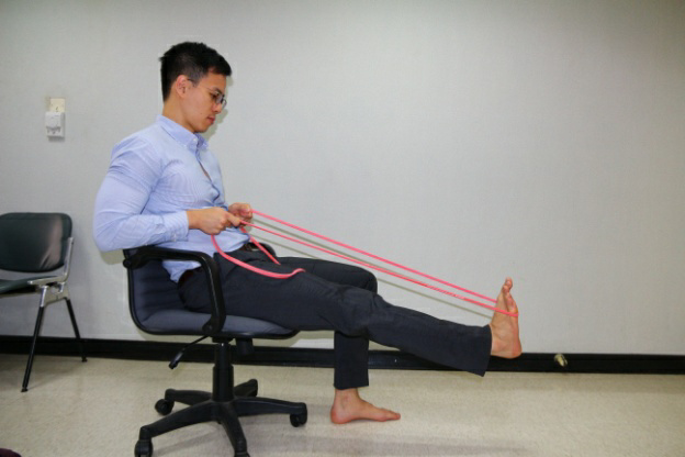 準備彈力繩或長一點的毛巾,套在足部上方,腿伸直,雙手用力將足部往身體內側拉,感覺小腿肚肌肉緊繃,10秒後放鬆,重複做能紓緩症狀。