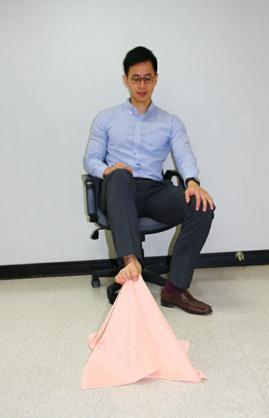 坐在椅子上,腳下放一條毛巾,腳心彎曲施力,使用腳底肌肉將毛巾抓起,保持施力狀態15秒後放鬆,重複10~15下,一天訓練三次,可增加腳底肌力。或用腳趾抓起小東西,再慢慢放下。