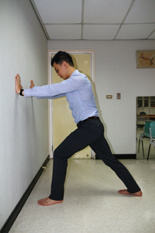 雙手推牆腳,需復建的腳往後跨一大步、呈弓箭步,後腳跟不離地,感受小腿肚有拉緊的感覺,目的在於把緊繃的小腿筋與足底筋膜伸展放鬆。每次維持20秒,每回合做10次,一天三回合。