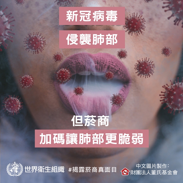 5月31日世界無菸日,世界衛生組織(WHO)公布2020年菸害防制重點:「真相大白:菸商鎖定新世代」,揭露菸商鎖定年輕人行銷新型菸品的手法,促請各國政府確實管控或禁止新型菸品危害、保障下一代健康。「華文戒菸網」推出「531專區」https://bit.ly/3ceO32H ,整理收錄2020世界無菸日中文版宣導素材,也籲請政府盡快修法,確保下一代健康。