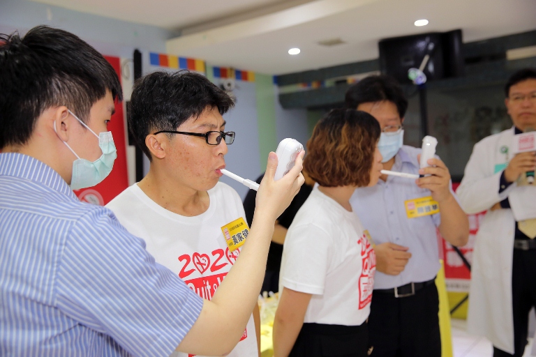 「2020戒菸就贏比賽」戒菸成功候選組,經醫師與律師檢測及見證戒菸成功。圖為貳獎候選組黃家健、張嘉玲進行一氧化碳檢測。