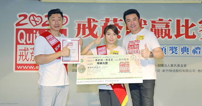 「2020戒菸就贏比賽」設有獎金30萬元首獎1組及6萬元貳獎6組,還有大車隊司機專屬特別獎3萬元3組。除了其中一組為收容人將於法務部頒獎典禮時進行檢測之外,在通過地方衛生局的訪視、初步檢測,並簽下切結書之後,今天共九組戒菸成功得獎候選組齊聚一堂,在均衡法律事務所李鳳翱律師見證下、接受高雄榮總戒菸治療管理中心主任薛光傑醫師的公開檢測,確認得獎資格並接受頒獎,分享戒菸過程的甘苦及成功戒菸的撇步。國民健康署王英偉署長、代言人李㼈、終身義工陳淑麗、義工周子寒全程參與、頒獎、主持。