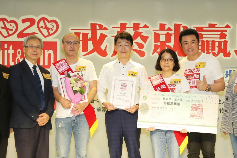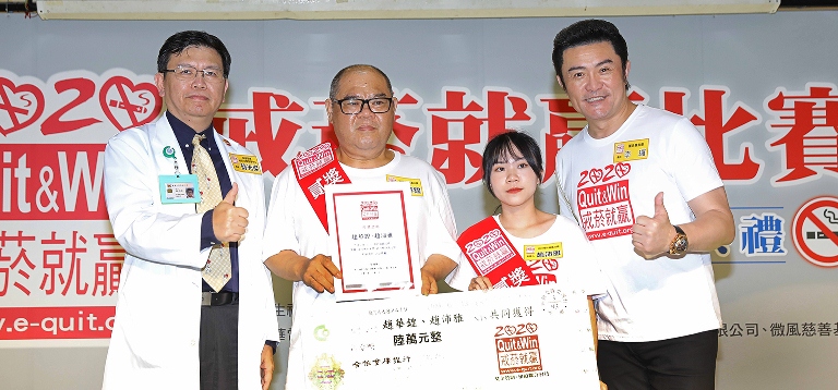 30萬元首獎得主林文傑(左二),因為三總心臟內科林嘉璋醫師(左三)的一句話:「不想裝心導管的話就要馬上戒菸。」就決定報名戒菸!