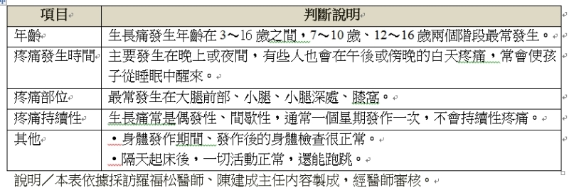 對於孩子成長的生長痛,振興醫院復健部運動復健科主任陳建成表示,目前對學童的調查研究顯示,有10~20%的兒童、青少年有生長痛,女孩子高於男孩子,由於醫學診斷生長痛並無明確原因,是用「無法解釋、反覆發作、四肢疼痛,一、兩年後會消失」的特徵說明生長痛。