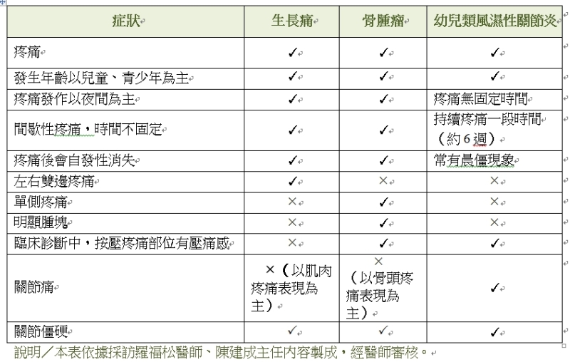 陳建成主任指出,可以從發生年齡、發生時間、疼痛部位、疼痛感受做相同及不同的初步比較。下圖為「生長痛或骨腫瘤、幼兒類風濕性關節炎症狀同異處參考表」: