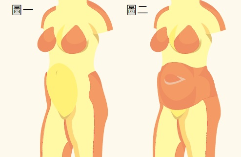 圖1是年輕女性的脂肪分布,到圖2的更年期肥胖,脂肪明顯由大腿、臀部上移到腹部,且胸部的脂肪分布也下移,使乳房下垂。此外,更年期的脂肪體積增加約三成,也就是不如以往緊緻,變得更鬆垮了。