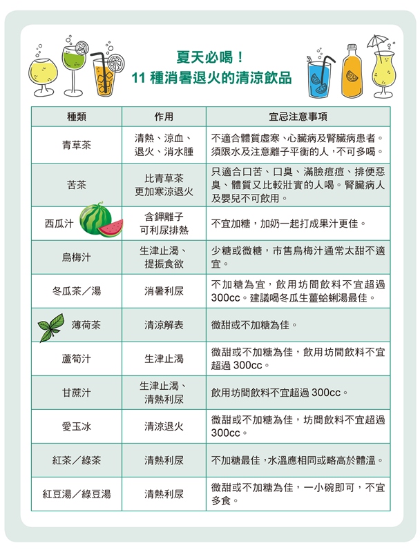清涼退火的食物,如西瓜汁、愛玉冰、綠豆湯、冬瓜茶等,程涵宇營養師說,都屬於甘涼的食物,含有較多的水分及鉀離子,可利尿帶走熱能,所以可消暑退火。