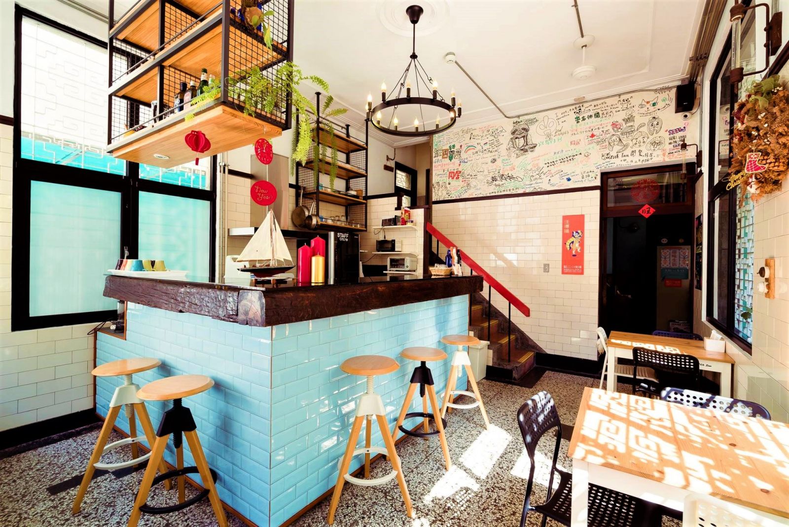 1960年代台式老宅的經典元素──磨石子與鐵窗花躲藏在旅店中的各個角落,深藏在新崛江的熱鬧巷弄中,同‧居保留住台灣傳統建築的工藝特色。地板上一顆的馬賽克磁磚歷久不衰,透過內部的改造,有著半甲子年歲的陳舊建築似乎套上了一件新的衣裳。偷偷告訴你,同‧居時常接待許多來自各個國家的旅人,你可以用一瓶打狗啤酒,交一個外國朋友!