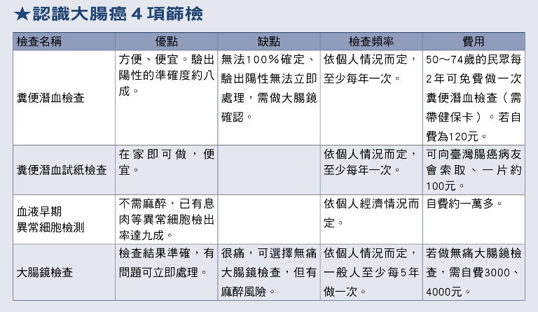 3. 有家族史者》父、母親直系血親中,有任何一人罹患大腸癌(包括息肉和癌症),則將患者年齡減10歲,便是自己開始檢查的時間點。例如父親45歲得到大腸癌,孩子在35歲就要每年做一次糞便潛血檢查,其後則是每5年做一次大腸鏡檢查。