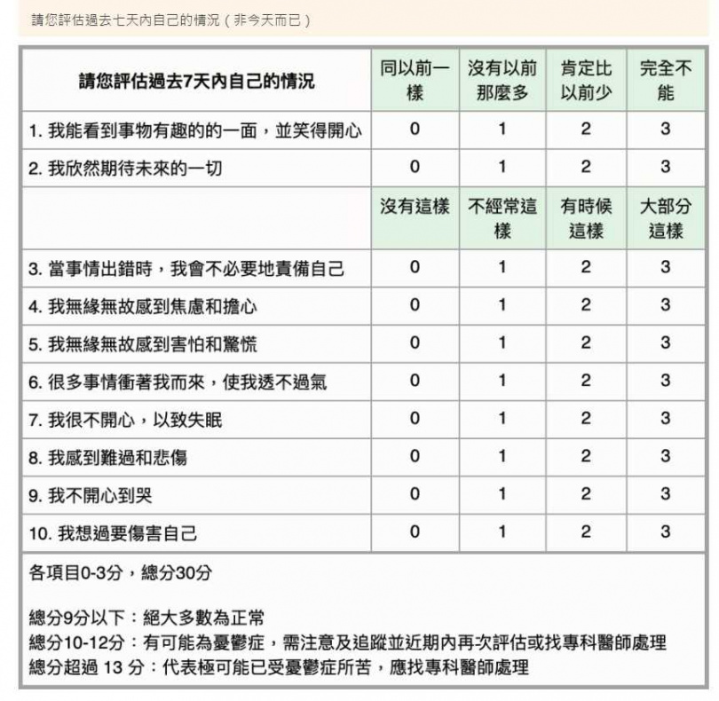 下圖為愛丁堡產後憂鬱症量表,共十題。可自行檢測,若得分超過10分,就有可能已罹患產後憂鬱症,建議尋求專業協助。