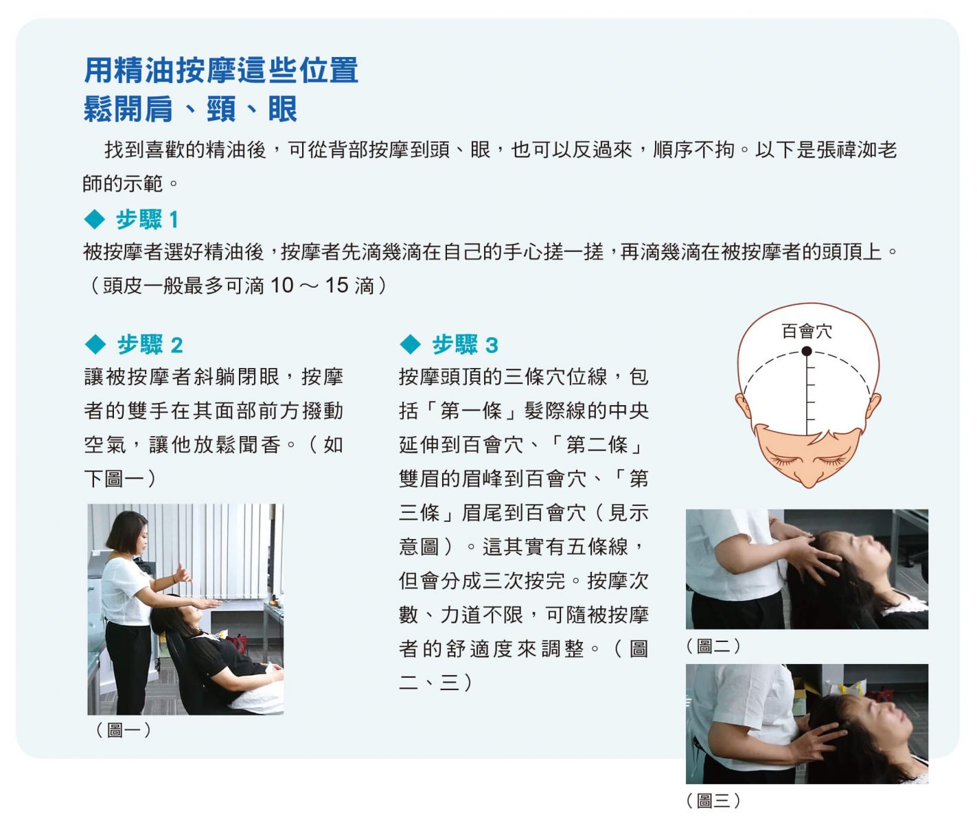 精油的挑選是按摩的重點,常到企業進行紓壓講座的AFA中華亞太香氛精油樂活協會講師張禕洳說明:「因為精油的分子小,使用精油來按摩,可透過皮膚進入體內,所以選擇精油時,應盡量選擇高品質、不含人工合成添加物的產品。」