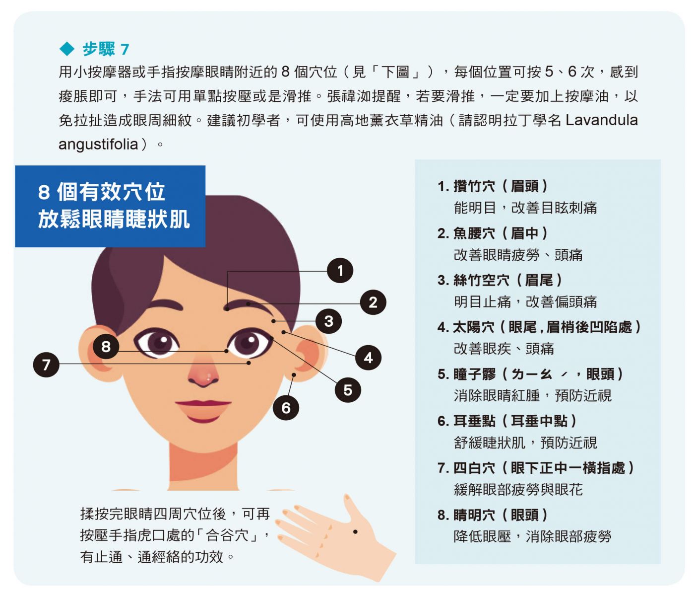 另外,張禕洳老師建議使用化妝棉沾「純露」來濕敷雙眼,還可以搭配輕音樂,進行約20分鐘的放空或冥想,會有深層的放鬆效果。所謂「純露」是指在萃取精油的過程中產生的副產物;由於蒸餾法會產出精油、蒸餾水及植物本身的水分,純露即是後面兩者的混合物。