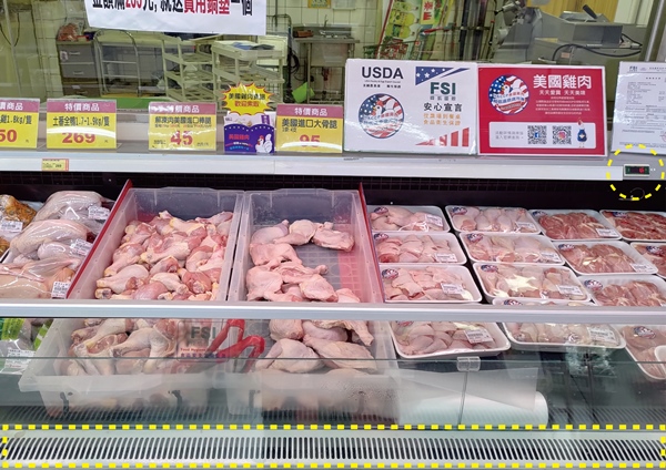 照片中的美國雞腿都是冷凍進口來臺的,賣場也在陳列櫃上標示「冷凍肉解凍」,解凍後的美國雞腿肉色粉紅,骨髓呈鮮紅色,仍維持良好的鮮度。如果看到肉色偏褐,甚至骨隨變褐變黑,就意味著陳列太舊或溫度控制不佳,鮮度不佳。