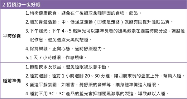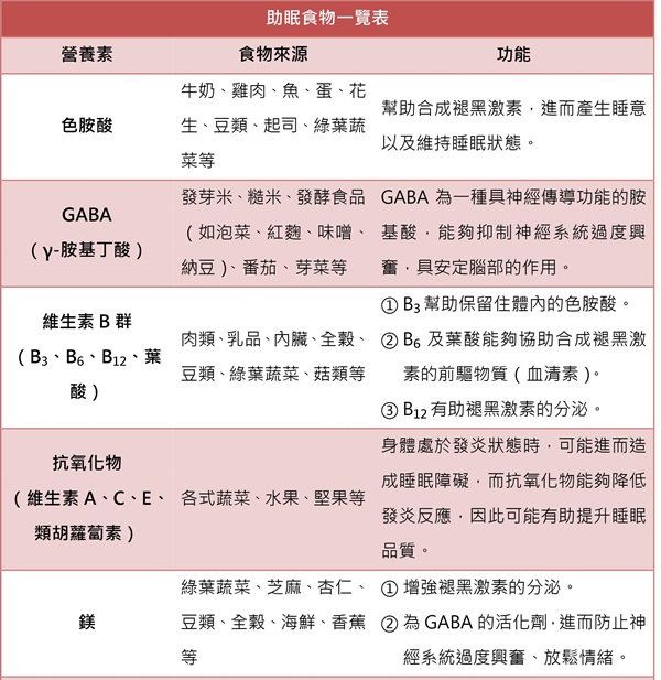 其他包含GABA、維生素B群、抗氧化物(如維生素A、C、E)、鎂等營養素,也有益於提升睡眠品質。但要留意的是,補充品不能完全取代原態食物。養成健康的飲食習慣,均衡攝取蔬菜、水果、全穀、堅果、豆魚蛋肉類等各式原態食物,就能獲得助眠所需的營養素。