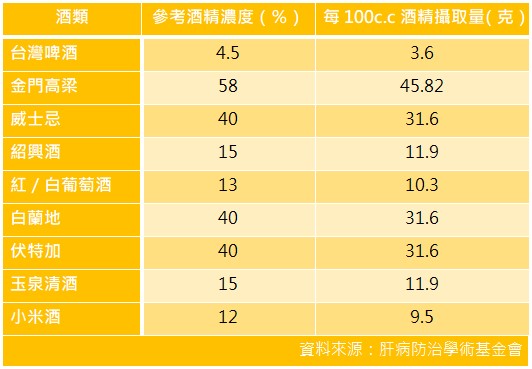 以下的表格也羅列了一些常見的酒類,分別喝100c.c會喝進的酒精量: