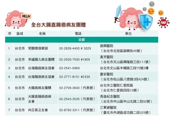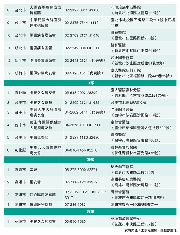 王照元醫師表示,腸癌開刀除了開腹手術外,目前是以微創手術為主,病人身上僅有3、4個0.5公分到1公分傷口,不用擔心很難照料;化療藥物不再只有針劑,已有口服劑型,不用等病床住院治療,居家治療即可,提高治療便利性,適合不適應針劑化療者、高齡長者、或有工作不方便常請假到院治療者。此外,各大醫院及社會團體皆有大腸直腸癌病友團體(見整理表),病人可透過病友間的經驗分享與相互支持,重拾治療信心。(延伸閱讀:大腸癌有家族史者只占兩成,預防需破解5大盲點)