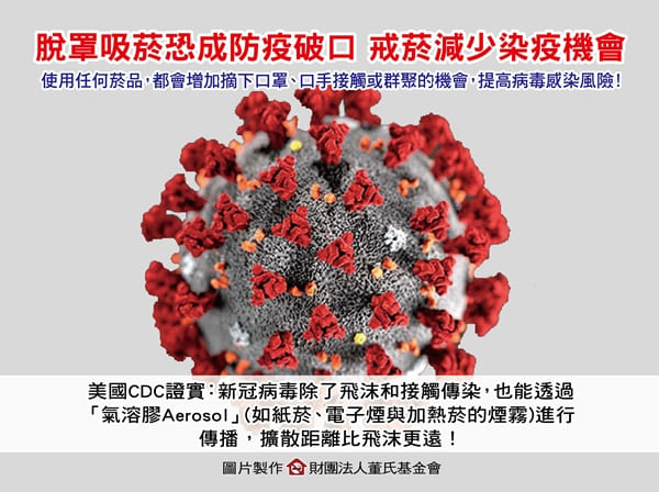 董氏基金會接到民眾申訴,在篩檢站周邊脫口罩吸菸的民眾增多,對民眾健康造成威脅。目前疫情嚴峻,在外脫下口罩就會增加新冠病毒感染風險,更何況是脫口罩吸菸。醫師指出吸菸導致吸菸者需氧量增加,或降低了身體正常利用氧氣的能力,使得罹患呼吸道感染的吸菸患者出現雙側病毒性肺炎風險較高。醫師呼籲,戒菸可減少染疫風險。