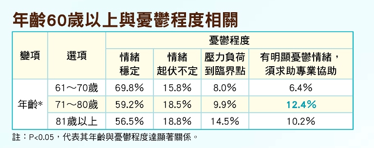 使用「臺灣人憂鬱症量表」做為憂鬱程度測量工具。有10.2%民眾「有明顯憂鬱情緒,需尋求專業協助(包括諮商、醫療)」。進一步分析60歲以上受訪者與憂鬱的相關性,「71~80歲」者「有明顯憂鬱情緒,需尋求專業協助(包括諮商、醫療)」的比例較高,占12.4%,且達顯著。