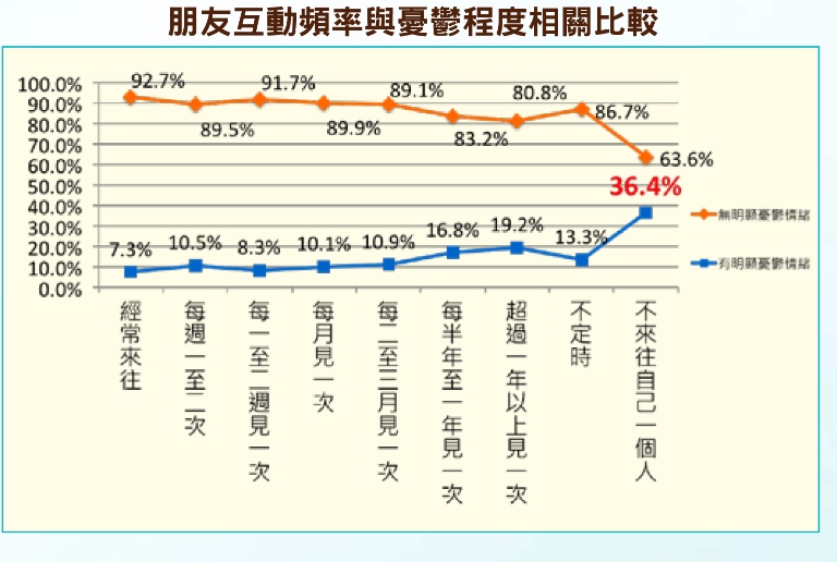 分析民眾與朋友碰面互動頻率與憂鬱程度的關連,互動的頻率選項由高至低分為九個,自頻率較高的「經常來往(一週以上超過3次以上),往下遞減至「不來往自己一個人」。發現「不來往自己一個人」者,其「有明顯憂鬱情緒,需求助專業協助(包括諮商、醫療) 」的比例較高,占36.4%,且達顯著。