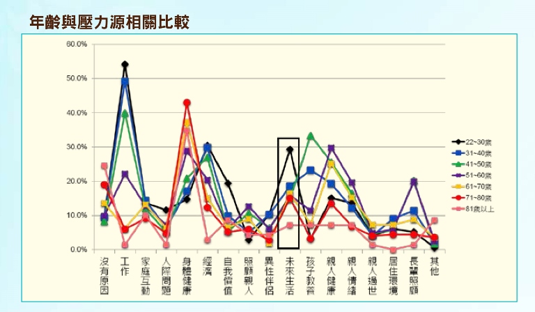 詢問受訪民眾感到壓力的事件,全體受訪者的前五名壓力源排序為「工作」、「身體健康」、「經濟」、「親人健康」、「未來生活」。至於60歲以上的受訪者,前五名壓力源排序則為「身體健康」、「親人健康」、「沒有原因」、「未來生活」、「經濟」。