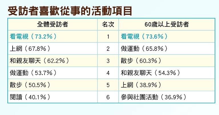 全體民眾及60歲以上受訪者最喜歡從事的活動均為「看電視」,全體受訪者前6項最喜歡從事的活動,依序為「看電視」、「上網」、「和親友聊天」、「做運動」、「散步」、「閱讀」。60歲以上受訪者前6項最喜歡從事的活動則為「看電視」、「做運動」、「散步」、「和親友聊天」、「上網」、「參與社團活動」。
