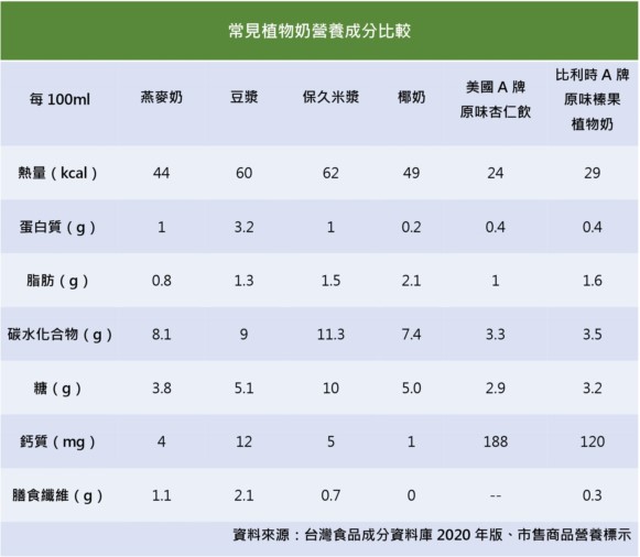 如果以台灣較常見的幾種植物飲品和同等份量的牛奶相較,豆漿的蛋白質含量與鮮乳差不多,但鈣質少了7~8倍之多;燕麥奶比鮮乳多了膳食纖維,更含有可調節膽固醇的水溶性膳食纖維「β-葡聚醣」,可是碳水化合物較高,蛋白質及其他礦物質含量則較低,而且也不適合麩質不耐受患者飲用;用米和花生製成的米漿,飽和性脂肪較少且含有膳食纖維,雖熱量與全脂鮮奶相近但碳水化合物含量明顯偏高。(延伸閱讀:想靠「七日豆漿減肥法」瘦身,白豆漿、黑豆漿、鹹豆漿,喝哪一個才不會胖?)