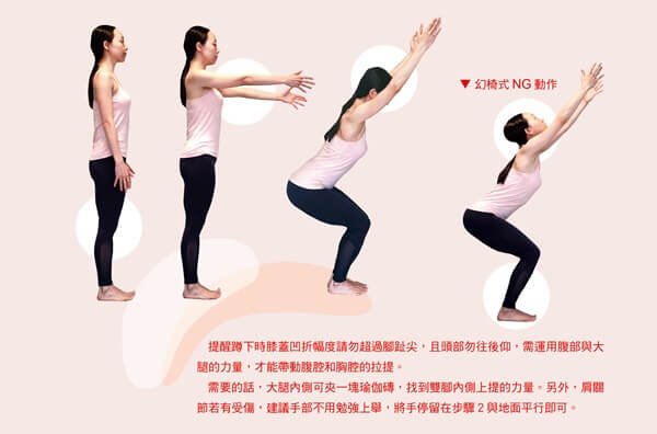 3. 吐氣,屈曲髖關節連帶到膝關節與踝關節,臀部穩定下沉至小腿大腿與上半身呈現閃電形,同時雙手向上延展至耳朵旁(雙手與肩膀需與耳朵保持距離),維持3~5個呼吸(呼吸過程中,脊柱持續延伸,同時累積更多腹部力量,吐氣時記得感受臀部自然往下沉,臀部下沉的空間最多到大腿平行地板)。