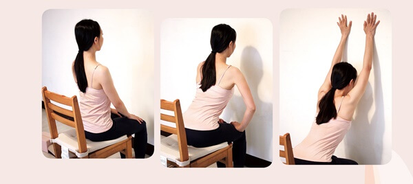 若是因為膝蓋或腳踝受傷無法完成「幻椅式」動作的人,可透過椅子輔助的瑜伽姿勢來練習,與「幻椅式」動作相比,是較為簡易緩和的動作,但同樣可以矯正骨盆、延展身體前側,帶動橫隔膜來改善脹氣問題。