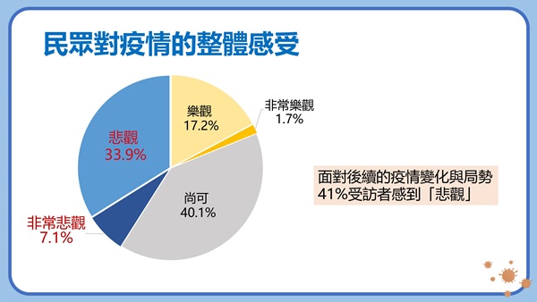 面對後續疫情的變化與局勢,四成一是「悲觀」的,進一步分析發現,感到悲觀的比例,男性高於女性;沒有維持運動習慣者,也高於有運動習慣者。