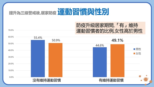 居家期間超過五成(52.4%)受訪者「沒有」維持運動習慣,女性「有」維持運動習慣的比例比男性高,占49.2%;「沒有」維持運動習慣的受訪者,其每日坐著時間為「13~16小時」的比例多於有運動習慣者。