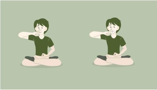 ▲參考左圖,收回手,將右邊鼻孔壓住;參考右圖,從左邊鼻孔吸氣,吸的時候慢長細,吸到最飽的時候憋氣三秒,接著用力快速從左鼻孔出氣,出氣的時候快急粗。