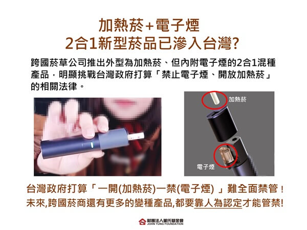 姚思遠指出,去年底政府轉向「一開(加熱菸)一禁(電子煙)」政策,現在馬上就出現2合1產品,顯然菸商已做好因應政府政策的準備,「請政府務必在疫情逐漸緩和之際,加快修法腳步,禁止電子煙、加熱菸等所有新型菸品,不要讓菸商有機可趁。」