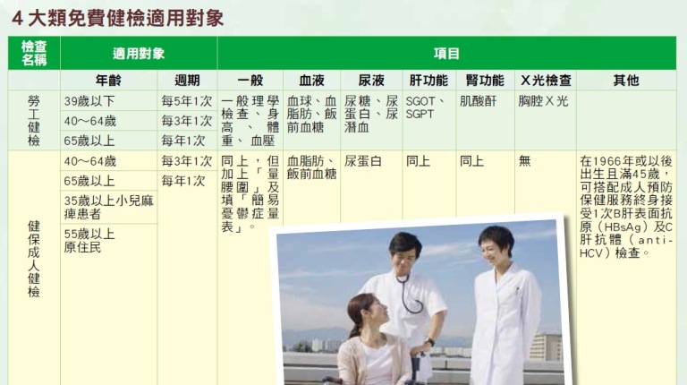 目前的免費健檢分成4大類,分別是:勞工、成人、老人跟四癌篩檢。其中勞工健檢是根據《勞工健康保護規則》第10條規定,雇主必須提供員工定期檢查,但實務上有些雇主並未確實給予員工這項福利。
