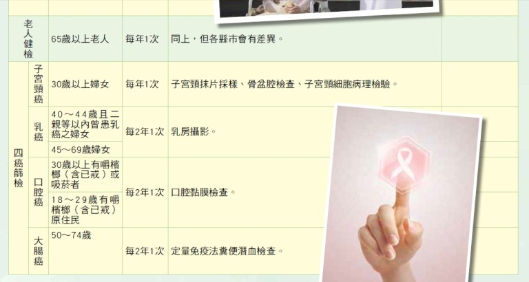 而成人健檢、四癌篩檢都是由衛生福利部國民健康署主辦,但由特約醫療院所執行檢查。當符合資格的民眾到這些處所做完檢查後,該機構再向國健署申請費用補助,所以民眾不需付費,至於掛號費,有些醫療院所會收、有些不收。