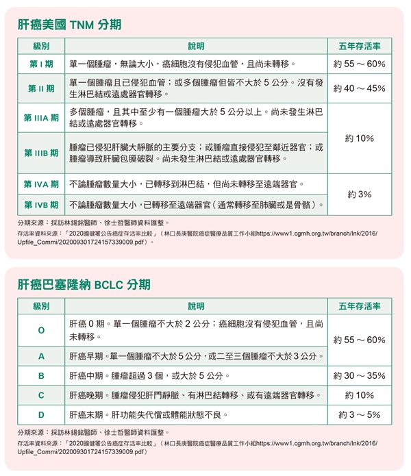 臺灣肝癌醫學會理事長、林口長庚醫院胃腸肝膽科系副科系主任林錫銘醫師表示,台灣肝癌分期多採用美國TNM與巴塞隆納BCLC二大癌症分期系統並行的做法。T代表原發腫瘤大小、局部侵犯程度;N表示腫瘤局部區域淋巴腺蔓延程度;M代表是否遠端轉移。BCLC有分0、A、B、C、D期,根據腫瘤狀況(大小、數量、血管侵犯、淋巴侵犯、肝外轉移)、肝功能、患者體能狀態作出分期。