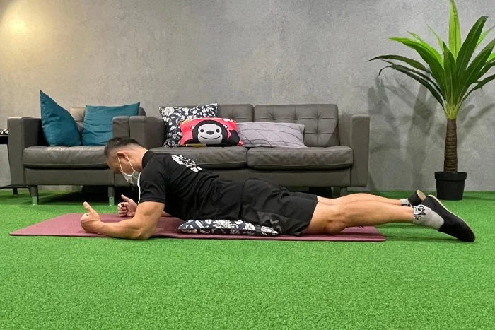 (1)俯伏於地面,雙手雙腳伸直,腳尖微微撐地,雙手掌心應向下平放在地上。