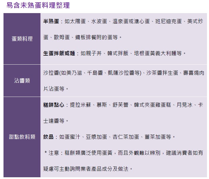 民眾外食時,在品嚐美味的同時更要注意衛生安全風險,尤其在炎熱夏日應多留意可能含有未全熟蛋品之料理,董氏基金會特別整理容易未熟之蛋品相關料理如下表。