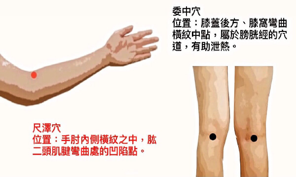 熱傷害會伴隨各種症狀,症狀輕微者可自行按摩穴位來改善。臺北市立聯合醫院仁愛院區中醫科醫師謝旭東表示,每個穴位的按摩時間以5分鐘為宜,用手指輕壓或揉按穴位,注意控制力道,按摩後若症狀加重或出現瘀青,可能用錯方法!