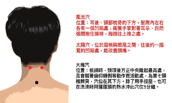 功效:祛除風邪、發汗解表、清頭目、利五官七竅,對於緩解頭痛、偏頭痛很有效,若同時有脖子痛、脖子僵硬等症狀,也能達到適度放鬆的效果,因此當熱感冒伴隨頭痛時,此穴位為首選。可另搭配太陽穴來改善頭痛。