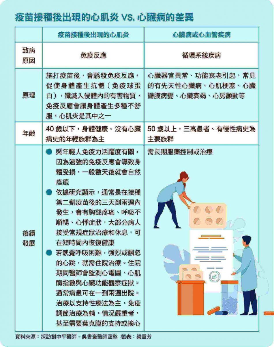 有些人接種莫德納疫苗後出現心肌炎,劉中平醫師解釋是一種發炎性的免疫反應,症狀多發生於年輕族群,與心臟病或心血管疾病肇因於循環系統疾病的機轉不同,兩者之間沒有相關性。