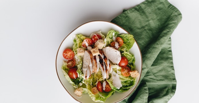 材料:帶皮(或不帶皮)雞胸肉100公克、玉米筍50公克、花胡瓜70公克、萵苣50公克、蘿蔓萵苣80公克、蛋一顆、小番茄60公克、青花菜150公克
