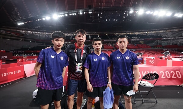 【圖/東京奧運中華桌球隊男團成員(左起)林昀儒、蔣澎龍教練、莊智淵、陳建安。】