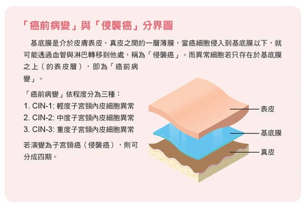 所謂「癌前病變」指的是細胞產生異常的病變,發生在皮膚的上皮(表皮)層;癌前病變並非癌症,若經過妥善治療,也大多可以完全治癒。癌前病變與子宮頸癌有一個界線,是表皮、真皮之間的「基底層」,基底層是一層薄膜;當癌細胞突破基底層之後,即稱為「子宮頸癌」。