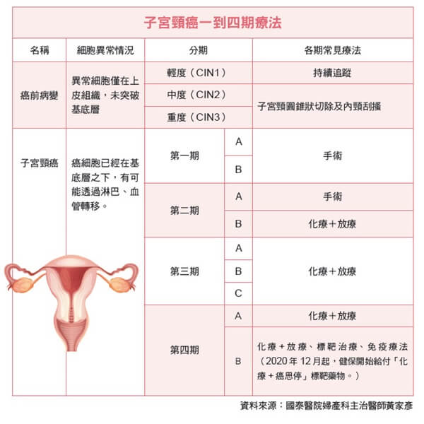如果切片結果顯示為子宮頸癌,表示它有侵襲、轉移性,必須找出是否已經轉移到周邊的組織,在第一期A時還可能採用圓錐狀手術來治療。