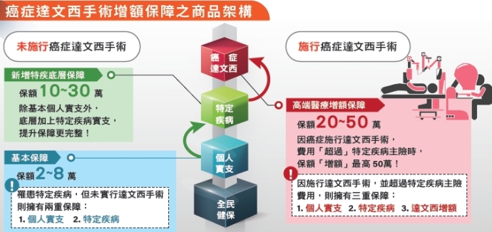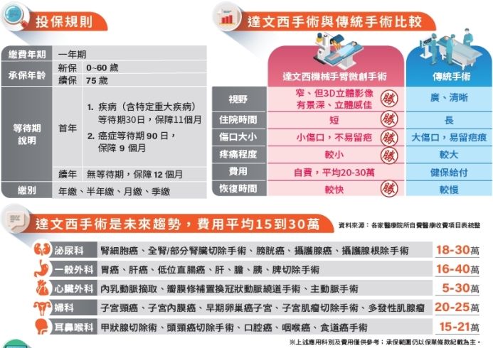 達文西手術為目前全球最先進的微創手術系統之一,超過2.4萬篇研究報告指出,運用機械手臂輔助手術可降低手術失血量、術後併發症、縮短住院時間等。目前達文西手術在泌尿科、婦科、一般外科、胸腔外科、大腸直腸科等科別都可運用,其中,攝護腺癌、部分腎臟切除術之達文西手術費已獲健保給付,但仍有許多達文西手術尚未納入健保給付,民眾仍需自費負擔手術費用,加上手術設備、醫材使用、病房升等與相關治療費用等,住院期間自費醫療費用對病患來說仍是一筆沉重的負擔。